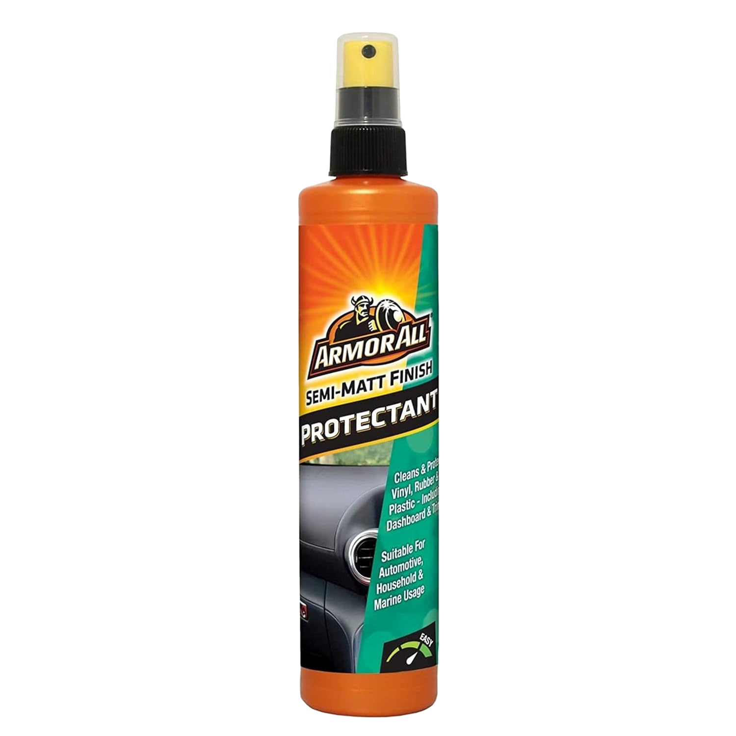ArmorAll Semi-Matt Protectant is designed to slow the natural deterioration of surfaces such as vinyl, rubber, plastic, treated leather and sealed wood.
