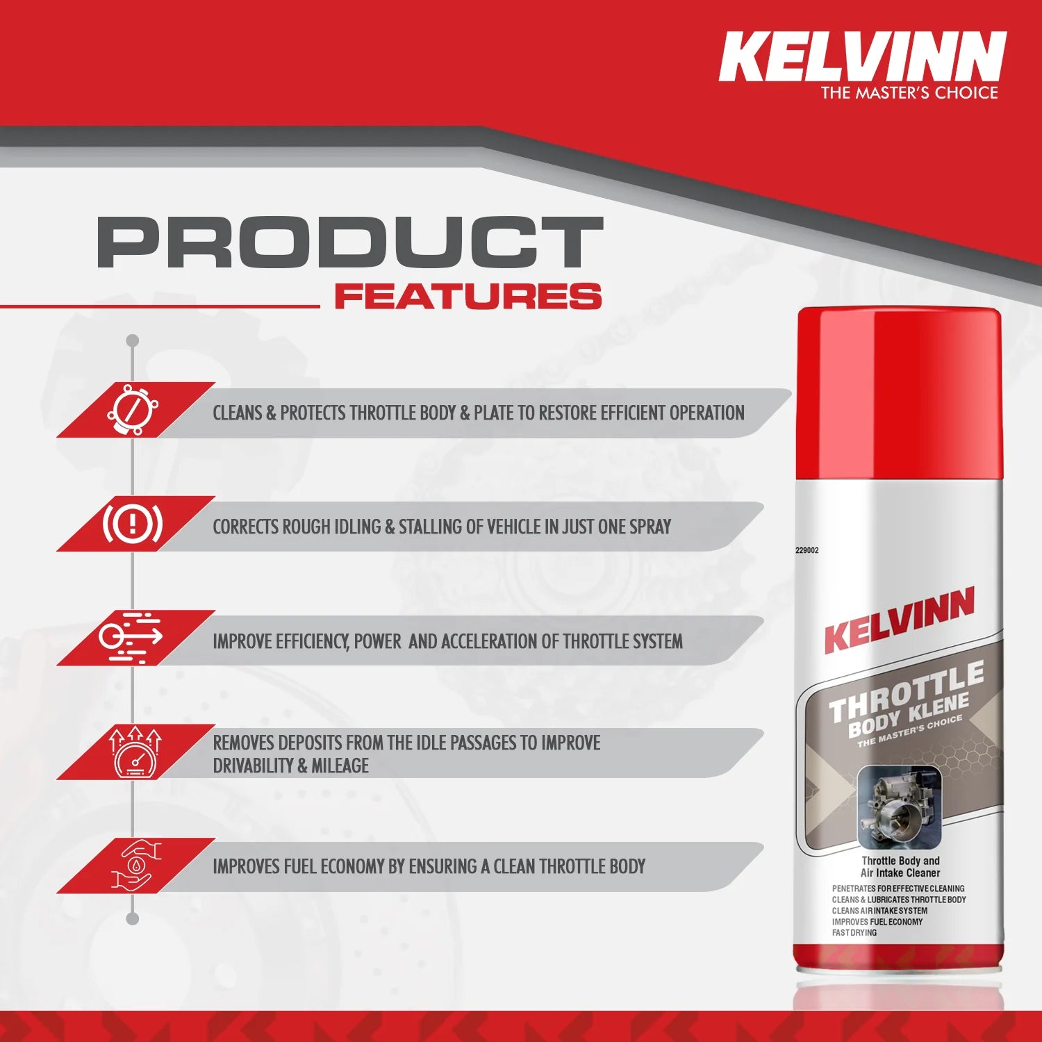 KELVINN Throttle Body Klene penetrates, dissolves and removes gum, varnish deposits, dirt, grease and other contaminants from all carburettor parts, throttle body, linkages, automatic chokes, linkages, PCV valves and heat raisers. For Auto Workshops, throttle body / carb & choke, linkages, automatic chokes, P.C.V. valves, and heat risers. It is specially formulated with active solvent for cleaning typical dirt and deposits in the air intake and throttle valve area. It loosens and removes all dirty deposits and dirt such as oil, resin, glue, etc. It guarantees the functional performance of the moving parts and reduces fuel consumption. It helps increasing the reliability of gasoline-powered engines.