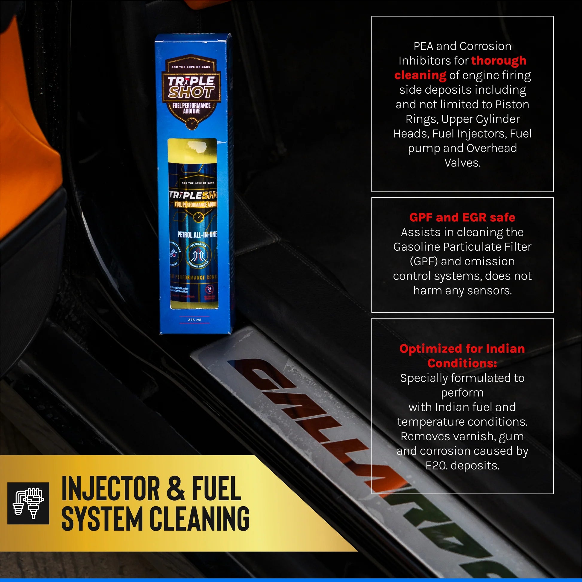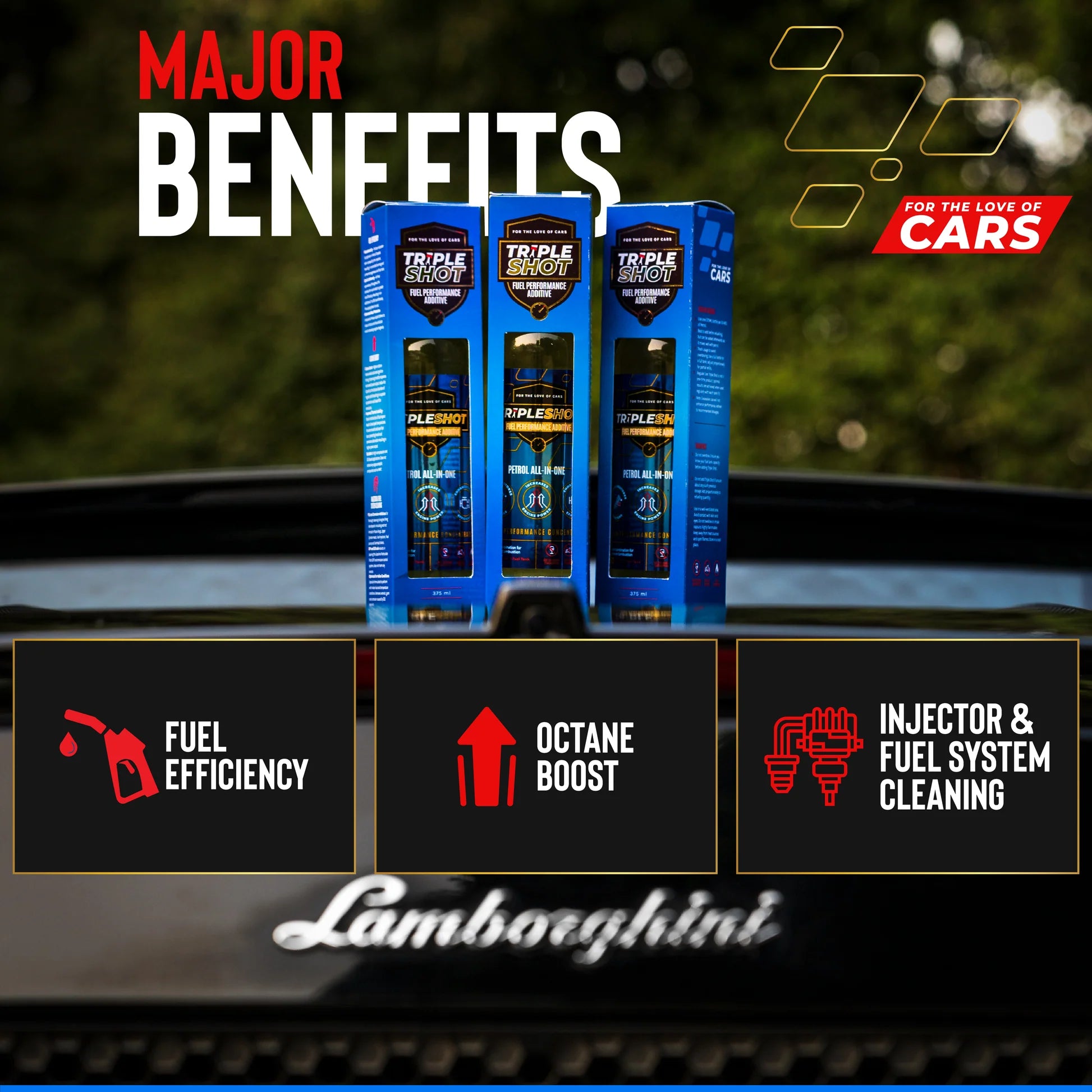 Tripleshot Fuel Performance Additive is a striking new formula to improve Petrol Performance for luxury and premium vehicles. It has an advanced new formula designed to clean and restore injectors, boost engine power and improve lubrication. Resulting in a much-improved fuel efficiency.